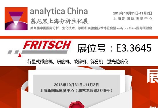 analytica China 2018慕尼黑上海分析生化展將于10月31日-11月2日在上海新國(guó)際博覽中心拉開(kāi)帷幕。預(yù)計(jì)有來(lái)自40多個(gè)國(guó)家和地區(qū)的1200家展商參展,展出面積達(dá)到3萬(wàn)平米。FRITSCH飛馳公司參加此次盛會(huì),展位號(hào):E3.3645。