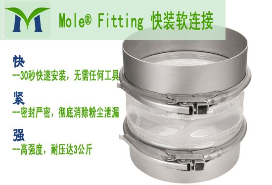 南京摩勒環保科技有限公司在展位N4G30現場展示最新軟連接產品Mole? Fitting 快裝軟連接,Mole? Fitting 采用標準管道設計,通過法蘭和特別設計的卡箍實現完美密封,具有以下特點: