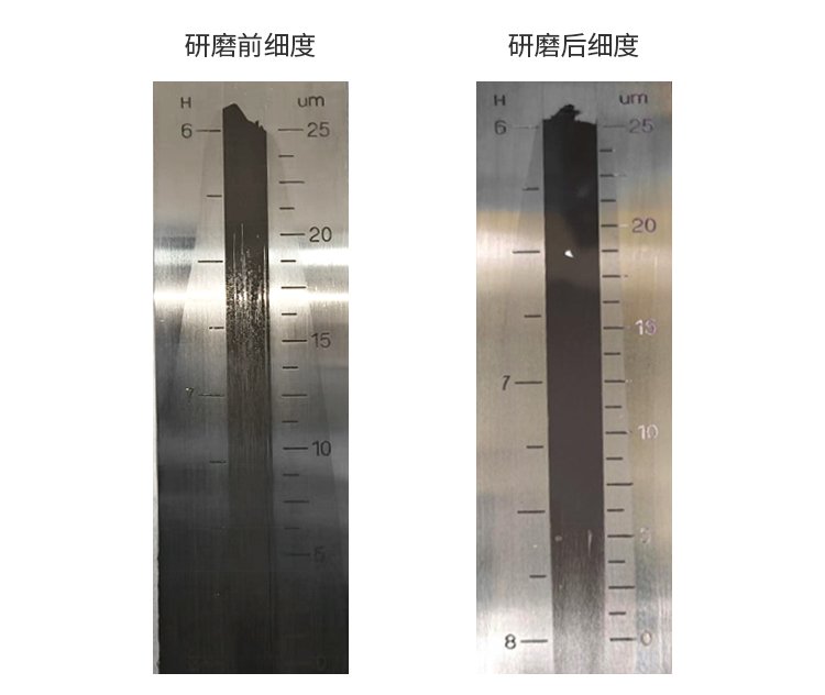3、取少量研磨后的材料再使用刮板細(xì)度計檢測細(xì)度,研磨后刮板細(xì)度計觀察材料已無大于7微米的顆粒。