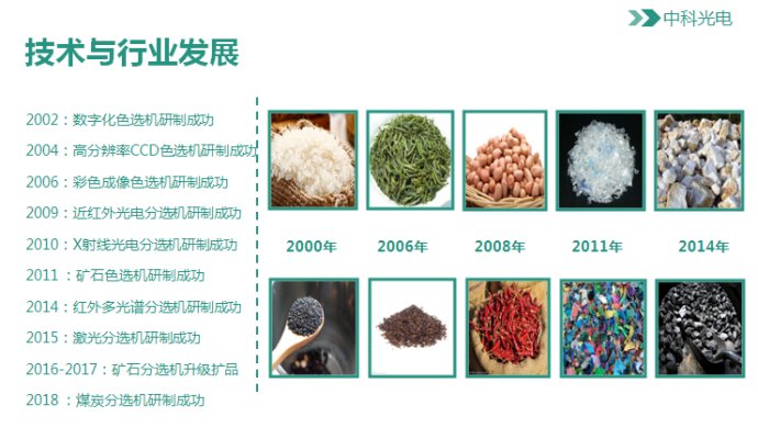 安徽中科光電成立16年來,一直專注于光電分選技術的開發和應用,從最初的糧食領域,到工業固廢,并從2011年進入工礦領域,將光電分選技 術重新帶回選礦實際生產中,經過七年的發展,從國內到國外,被一大批礦山企業(礦物加工企業)接受和使用。對礦物加工工藝和企業效益產生了實質改變。在新經濟環境中對企業環保及安全管理作出了有益的改善。