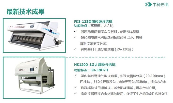 在礦物加工領域,從非金屬到金屬礦直至今年投入到煤炭分選技術及產品的研發,中科光電一直致力于國內光電分選的技術的進步和發展,為采選加工企業提供更好的產品和服務,為此,在以往的基礎上,改進了細粒級物料的分選技術,針對16-120目的產品性能達到國內領先,國際一流水平;也打破國外多年的壟斷,實現了30-100mm礦物的分選或預選,真正達到替代人工手選作業,對企業的增加效益,降低安全管理風險提供了可實際操作的方案;將16年的技術積累研制出了煤炭分選機,提供了環保、低耗、高效的煤矸分選技術,提高了煤炭洗選業的裝備及自動化水平。通過不斷的技術研發和應用研究將企業在工礦行業中的主導和領先地位夯實。