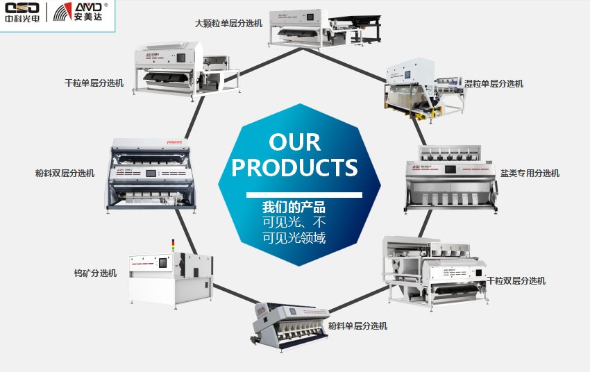 中科光電所推出的完全自主知識產權品牌——安美達牌系列色選機,可滿足大米、雜糧、茶葉、特種物料的精確選別,牢牢占領中國30%以上的市場份額,其中礦石色選機占中國70%以上市場份額,并成功遠銷美國、巴西、印度、印尼、東南亞等國家和地區。