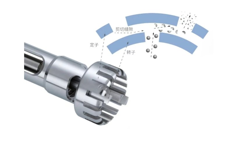 是一種用于將固體、液體或氣體分散到連續介質中的工業設備,廣泛應用于化工、食品、醫藥、涂料、化妝品等多個領域。操作過程中,將分散刀頭插入樣品中,馬達帶動轉子高速轉動,物料沿軸向被吸入分散頭,然后這些介質呈放射狀以較高速度通過轉子與定子之間的齒槽。高轉速的轉定子之間的微小間隙產生極強的剪切力和破碎力,從而達到良好的分散效果。因此,針對不同類型的樣品,不同結構的分散刀頭,對最終樣品的處理效果至關重要。