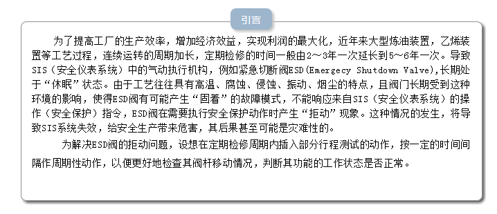 所謂ESD閥的部分行程測試(PST-Paitial Stroke Testing)是作為一種緊急切斷(ESD-Emergency Shutdown)閥的一種安全措施,在ESD閥系統中檢測故障的方法,就是讓ESD閥做周期性的部分行程動作。例如:ESD閥從全開位置部分關閉10-30%行程,按一定的時間間隔設定周期性的動作,以便更好地檢查其閥桿移動情況,判斷其功能的工作狀態是否正常。PST是一種不影響ESD閥正常運行的可靠的檢測方法。