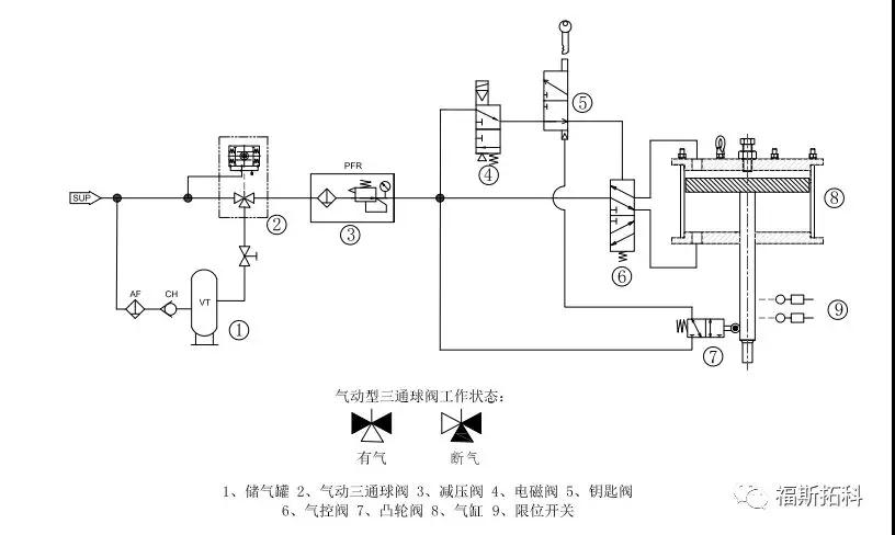 適用于直行程緊急切斷閥,當做部分行程檢測時,擰動鑰匙閥,這時鑰匙閥換位處于排氣狀態,氣控閥換向,執行器朝關閉方向移動,當執行器移動到設定位置時,預設撞塊會碰到凸輪閥,這時凸輪閥換向,儀表氣通過凸輪閥給鑰匙閥一個氣壓信號,鑰匙閥就會恢復到初始位置保持進氣狀態,氣控閥復位,執行器快速朝打開方向移動,恢復至測試前的狀態,完成部分行程的檢測過程。本系統除了具有部分行程檢測功能外,還附加斷氣保護回路,確保在供氣故障時整個系統的安全性,其工作原理是:平時正常工作時,一路氣通過三通閥經過濾減壓閥向主回路供氣;另一路是輔助回路,通過過濾器經單向閥向儲氣罐充氣,當出現供氣故障時,氣動型三通閥(在彈簧力作用下)自動換向,改由儲氣罐供氣,完成故障停車前的工藝操作,來滿足生產的需求。