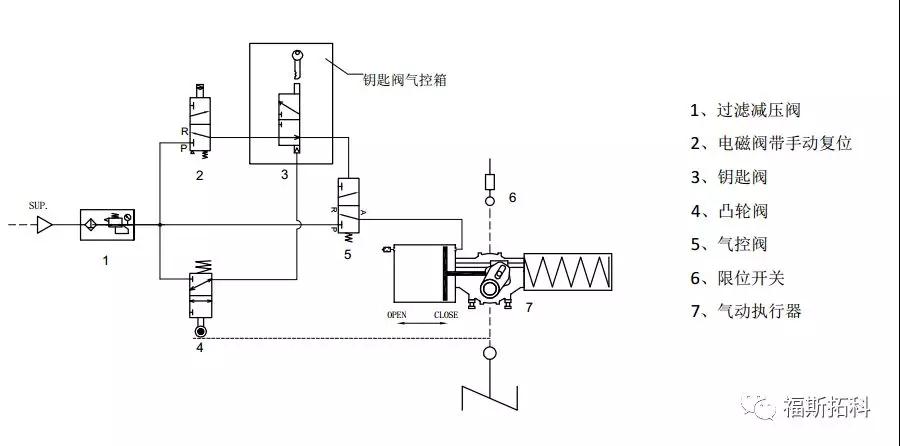 適用于回轉型緊急切斷閥,并能夠進行部分行程檢測,氣路圖電磁閥為非勵磁狀態,閥門狀態為關閉。采用2位3通帶手動復位的電磁閥,在開啟閥門時要確認電磁閥的手動按鈕是否在復位狀態,氣控閥用于快速進氣和排氣,實現緊急切斷閥門,失電失氣閥門關閉。