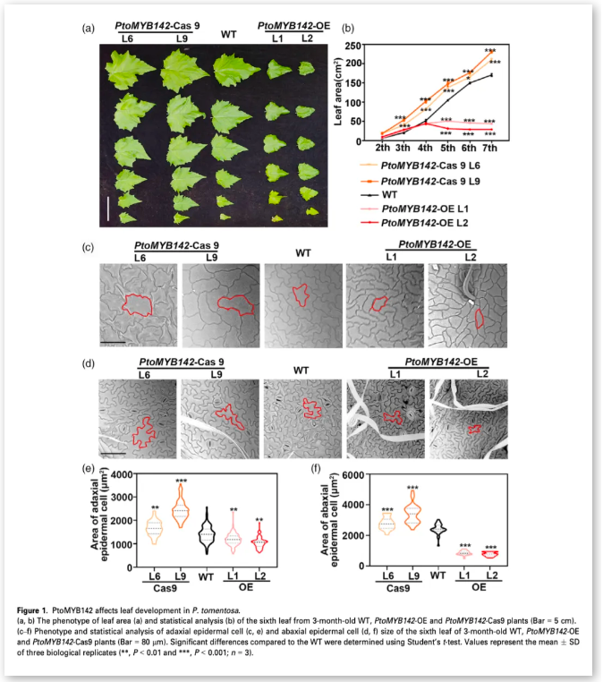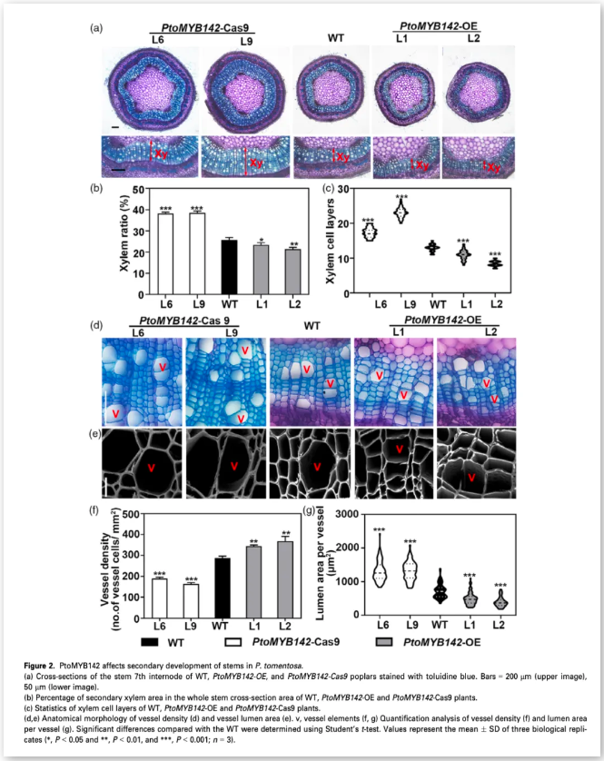 結果表明,PtoMYB142 過表達抑制了轉基因楊樹植株的生長,而敲除該基因導致相反的表型。定量分析表明,與 3 個月齡的 WT 植株相比,PtoMYB142 過表達(PtoMYB142-OE)植株的株高降低了 36-42%,PtoMYB142-Cas9 品系的植株高度增加了 26-30%。此外,PtoMYB142-OE 楊樹的莖直徑減少了 23-30%,PtoMYB142-Cas9 植株的莖直徑增加了15-22%。此外,與 WT 相比,PtoMYB142 的過表達導致節間較短,而該基因的敲除導致節間較長。綜上所述,這些發現表明 PtoMYB142 負向調控楊樹的空中生長。