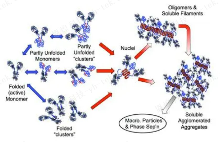 蛋白質(zhì)聚集體是在大小和構(gòu)象上有許多變化的異質(zhì)物種,蛋白質(zhì)容易聚集與其形成機制和儲存條件有關(guān),蛋白質(zhì)的聚集通常是經(jīng)過一系列的過程實現(xiàn)的,蛋白質(zhì)內(nèi)部結(jié)果發(fā)生變化后會形成二聚體或者寡聚體,這些將作為成核位點,引發(fā)更多的聚集,最終顆粒尺寸逐漸變大形成不溶性微粒。蛋白質(zhì)的聚集過程涉及到多種相互作用力,比如疏水作用、靜電作用、氫鍵、范德華力等,這些相互作用力是造成蛋白質(zhì)聚集的關(guān)鍵。