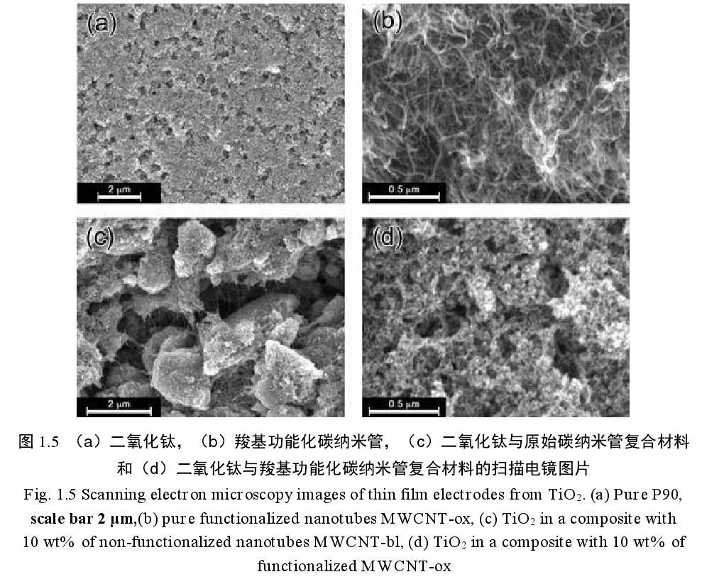Kavan 等通過將 MWCNTs 超聲分散在 Ti O2中制備成 MWCNTs/Ti O2復合負極材料,研究結果發現在碳納米管表面修飾一些羧基官能團后,能夠更好的與納米 Ti O2 顆粒結合。通過掃描電鏡圖片(圖 1.5)可以觀察到表面經過羧基修飾后的MWCNTs 與原始 MWCNTs 相比,分散性更好,在顆粒表面形的導電網絡更加均勻。雖然加入 MWCNTs 后 Ti O2 的容量并沒有提高,但是增加了鋰離子移動速度。近期有研究組將硅沉積在碳納米管骨架上形成同軸結構,其結合了硅的高容量和碳納米管的結構穩定性,成功實現了質量能量密度達到 1500A·g-1的鋰離子電池負極材料的制備。