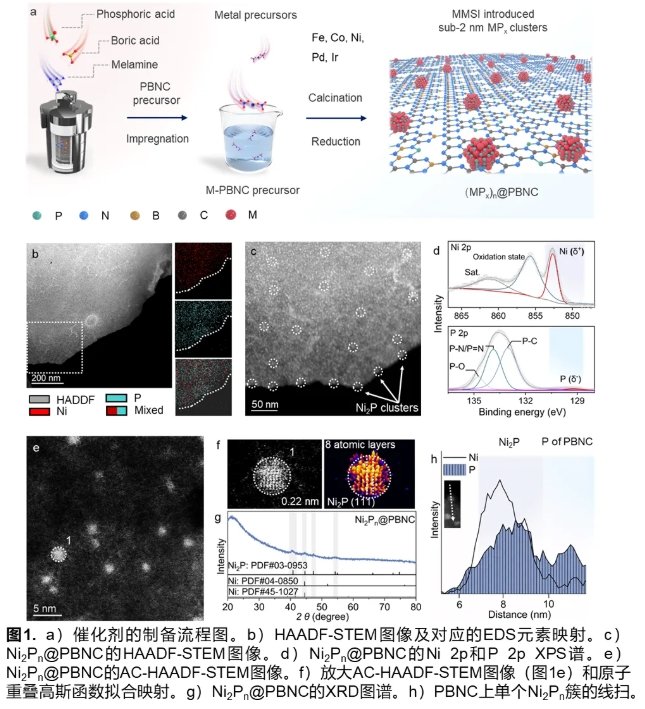 本文提出將 SMSI 與反應性金屬-載體相互作用 (RMSI) 協同作用來克服上述挑戰。綜合表征證實,SMSI 能穩定金屬在亞 2 納米范圍內,并調節 Ni1 可控聚集到 Nin 位點。同時,RMSI 通過充分激活載體中的 P 來調節 Nin,并最終生成亞 2 納米的金屬磷化物 Ni2P簇(Ni2Pn)。金屬與載體之間的協同作用引發了Ni2Pn的自適應配位和電子結構優化,從而實現了理想的底物吸附-解吸動力學。因此,Ni2Pn 在對氯硝基苯和炔醇的選擇性氫化方面的活性大大提高。目標產物的形成率分別是 Ni1 和 Nin 位點的 20.2 倍和 3.0 倍。這項工作可能會為金屬-載體相互作用開辟一個新方向,并促進 3 納米以下活性位點的創新和應用。
