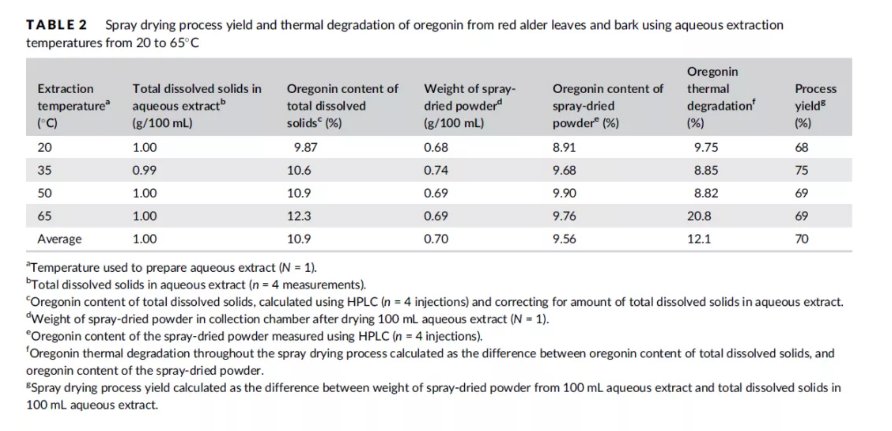 上面表格中詳細記錄了不同提取溫度下提取液的噴霧干燥產率,熱降解率等。