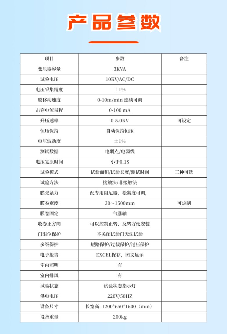 本儀器方式為微機控制,卷膜移動速度可設定,按照設定的升壓速率升壓,達到設定的電壓后,實時記錄當前的電壓值和電流值,并能夠實時記錄當前的擊穿點,試驗結束后自動歸零,自動統計電弱點數、電弱線數,自動計算每平方米的電弱點數。