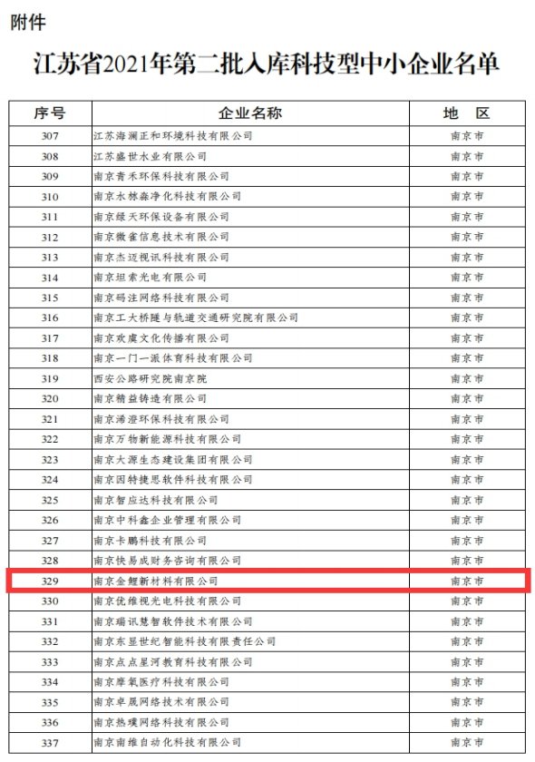 2021年4月,南京市科學技術廳公布了2021年第二批入庫國家科技型中小企業名單。通過不懈努力,歷經層層選拔,南京金鯉新材料有限公司入庫國家科技型中小企業。