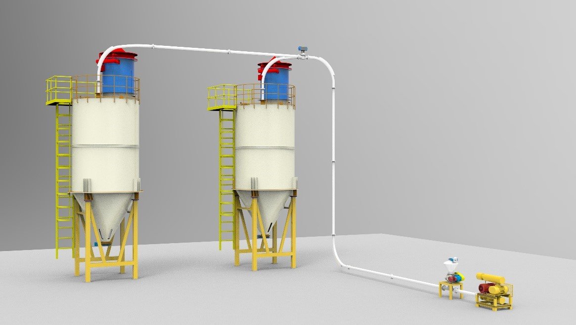正壓氣力輸送一般是將系統空氣管道與鼓風機相連,鼓風機通過入口吸入空氣, 將空氣壓縮后形成高壓氣流,高壓空氣沿輸送管道流動,帶動物料沿管道送入指定位置,通過氣動換向閥的切換實現多點卸料,換向閥起著改變物料的流向及任何方向的分流和匯合的作用。最后通過凈化裝置將凈化后的空氣排出。