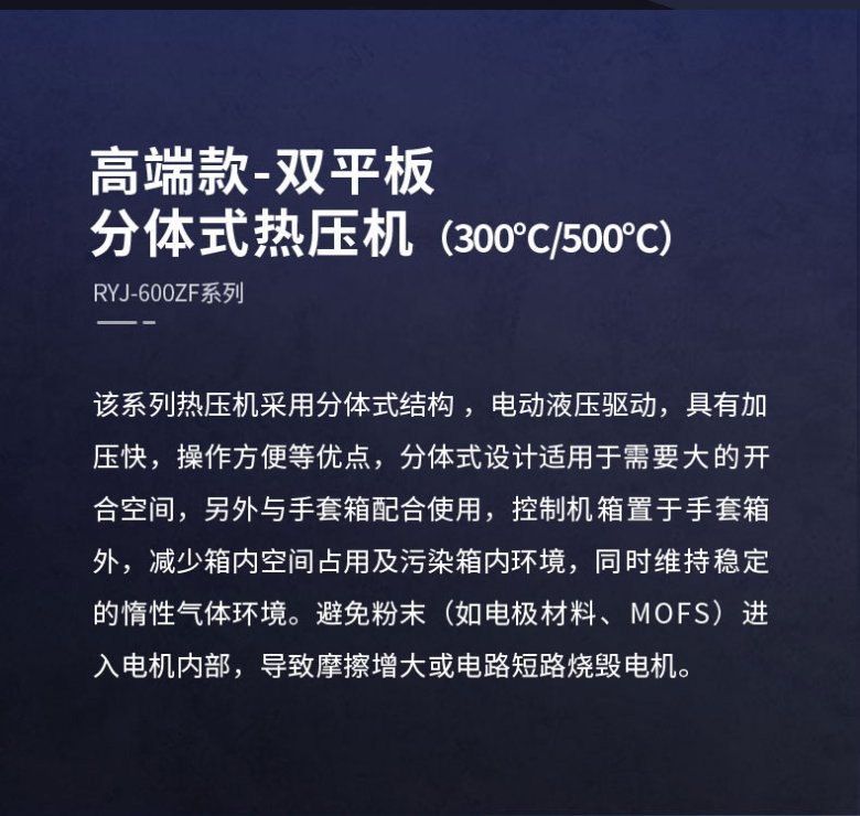 該系列熱壓機采用分體式結(jié)構(gòu) ,電動液壓驅(qū)動,具有加壓快,操作方便等優(yōu)點,分體式設(shè)計適用于需要大的開合空間,另外與手套箱配合使用,控制機箱置于手套箱外,減少箱內(nèi)空間占用及污染箱內(nèi)環(huán)境,同時維持穩(wěn)定的惰性氣體環(huán)境。避免粉末(如電極材料、MOFs)進入電機內(nèi)部,導(dǎo)致摩擦增大或電路短路燒毀電機。