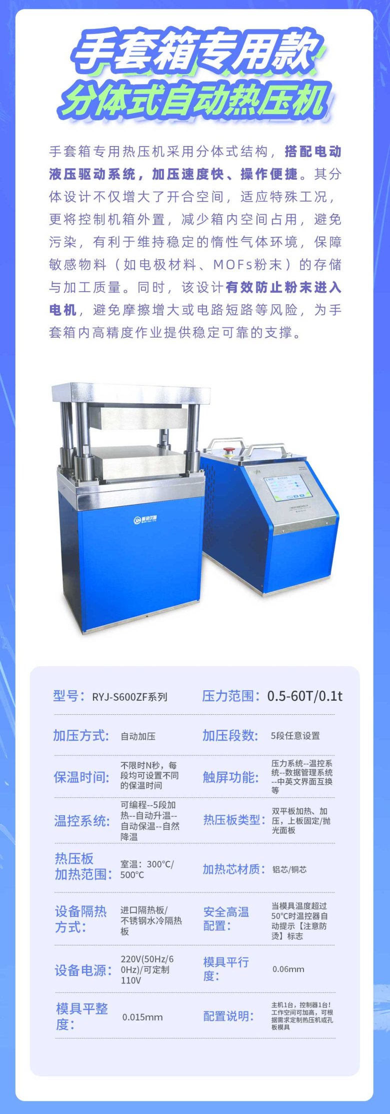 手套箱專用熱壓機采用分體式結構,搭配電動液壓驅動系統,加壓速度快、操作便捷。其分體設計不僅增大了開合空間,適應特殊工況,更將控制機箱外置,減少箱內空間占用,避免污染,有利于維持穩定的惰性氣體環境,保障敏感物料(如電極材料、MOFs粉末)的存儲與加工質量。同時,該設計有效防止粉末進入電機,避免摩擦增大或電路短路等風險,為手套箱內高精度作業提供穩定可靠的支撐。