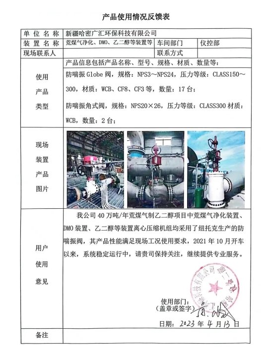 經(jīng)過哈密廣匯環(huán)保科技有限公司和中國五環(huán)工程有限公司的審核、批準(zhǔn),世界首套以荒煤氣為原料生產(chǎn)聚酯級(jí)乙二醇的裝置的核心部件——防喘振閥,由紐托克流體控制有限公司與沈鼓集團(tuán)股份有限公司聯(lián)合研制成功。
